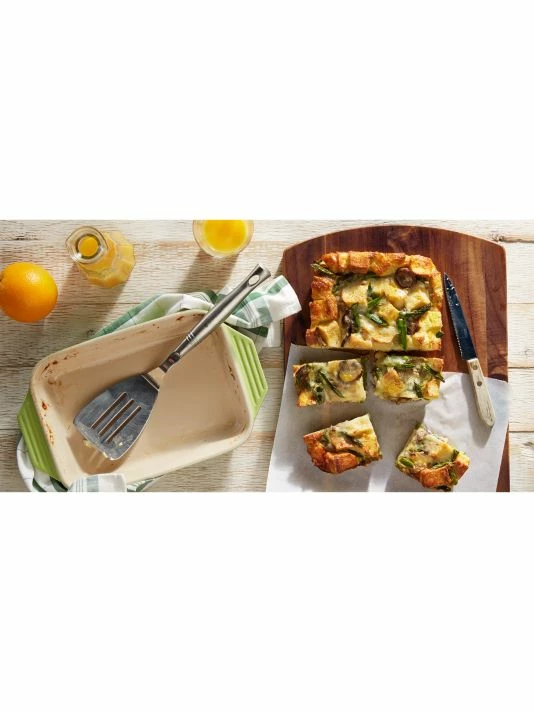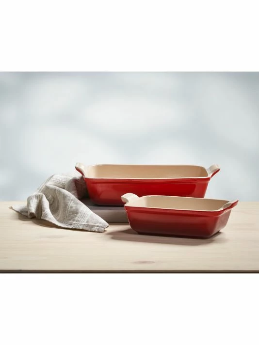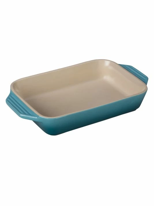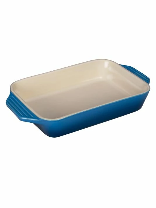 - Le Creuset’s newest line of stoneware features improved performance and contemporary design. The enameled base minimizes moisture absorption, while lengthened handles make for easier carrying.