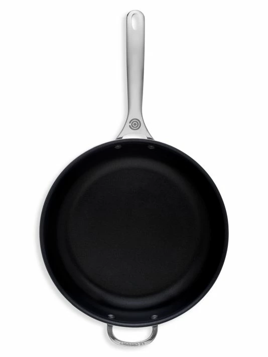 This stainless steel deep fry pan with a triple-layer construction is complete with a full base-to-rim aluminum core for superior heat distribution, helper handles for comfortable movement on the stovetop, and a lightweight titanium-infused stainless steel exterior that resists corrosion at higher temperatures.