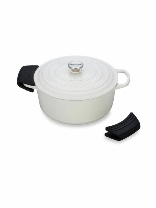 Silicone handle covers provide a sure grip and protect hands while cooking.