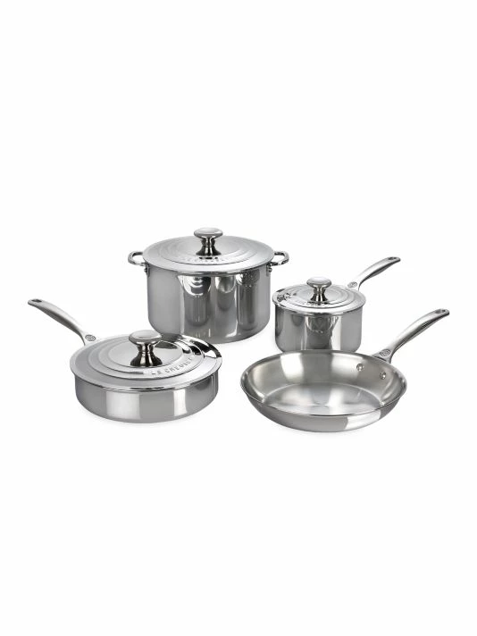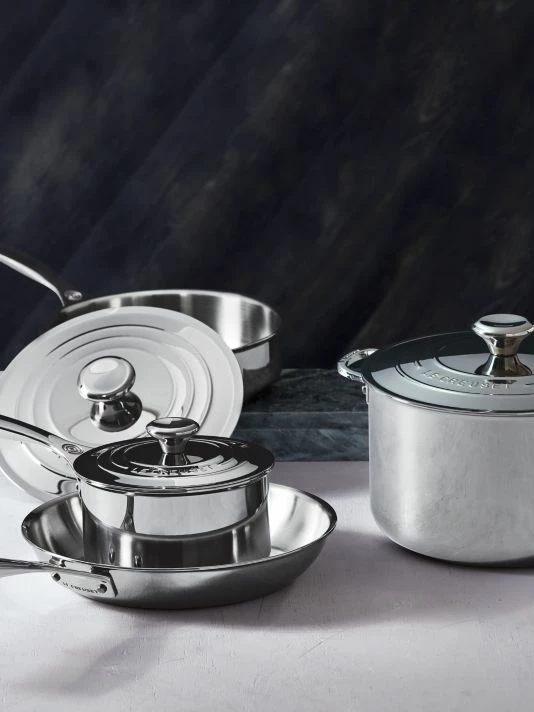The seven-piece stainless steel set is crafted by European artisans with a refined performance-driven design to master any culinary challenge, and includes some of Le Creuset’s best-selling pots and pans. Radiant and durable, the triple-layer construction features a base-to-rim aluminum core for superior heat distribution, while the lightweight titanium-infused stainless steel exterior resists scorching and corrosion.