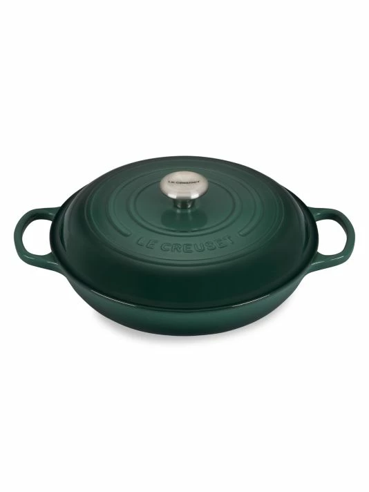 Signature braiser with lid crafted of cast iron works with all heat sources. Dishwasher safe and oven safe up to 500 degrees.