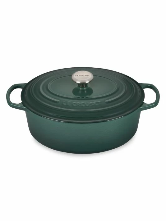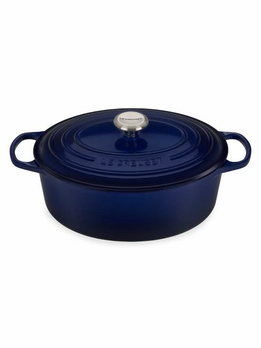 Signature oval Dutch oven crafted of cast iron with colorful glaze and coordinating lid. Le Creuset cast iron works with all heat sources. Dishwasher safe and oven safe up to 500 degrees.