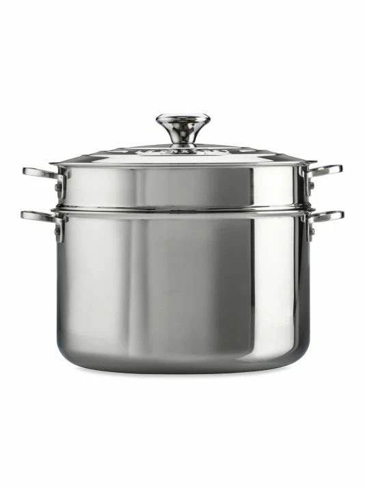 Le Creuset’s premium stainless steel reflects the same European craftsmanship and character that has defined Le Creuset cast iron for decades. The tri-ply construction of the stockpot conducts and distributes heat evenly, making it ideal for boiling vegetables, simmering soup or creating flavorful stock. Ergonomic side handles make lifting and transferring the pot more convenient. A full aluminum core heats quickly and evenly, and is protected by the rolled, sealed and polished rim. Magnetic external layer is induction-compatible and infused with titanium to resist discoloration. Inside layer is made of surgical-grade stainless steel for a safe and stable cooking surface. Precision-pour rim allows for clean, convenient pouring directly from the pan.