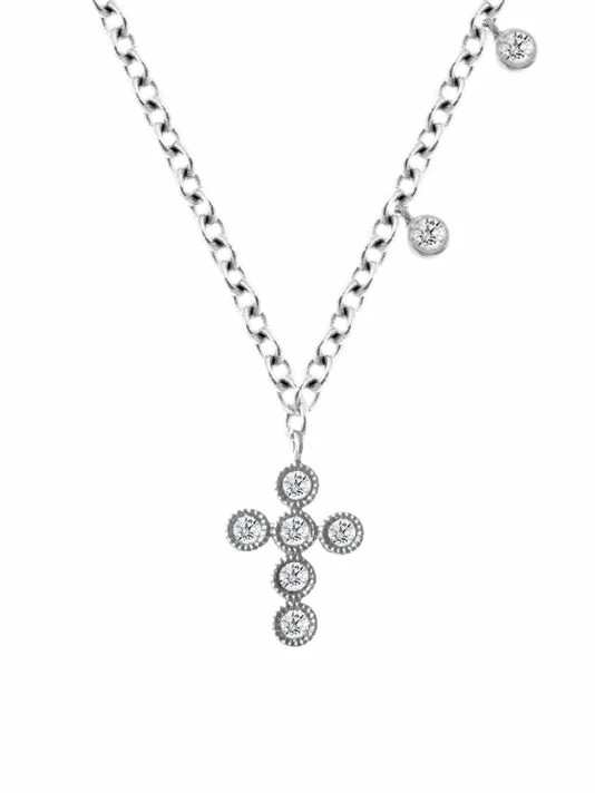 Elegant diamond cross pendant necklace accented with bezel-set diamond charms.