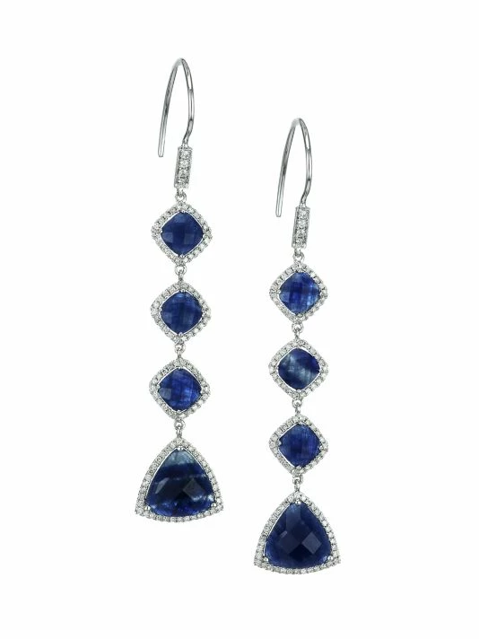 Luminous blue sapphires in a linear drop design with diamonds tracing the edges.