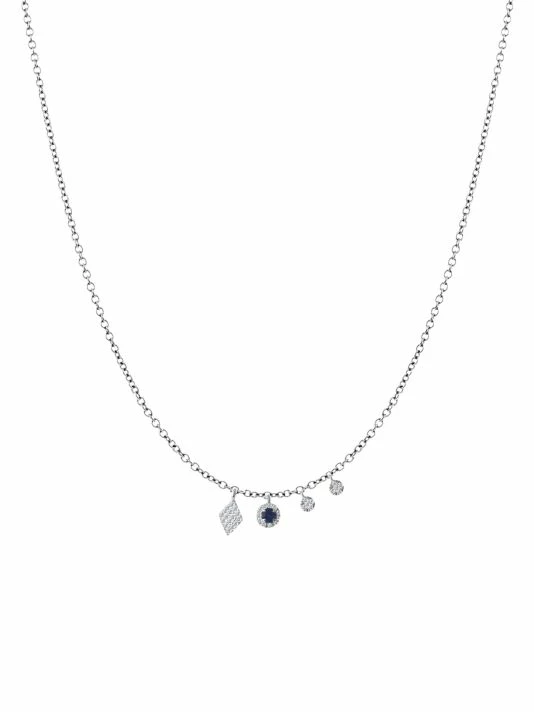 A mix of bezel, diamond and disc pendants create a feminine charm necklace shimmering with diamonds and a single sapphire.