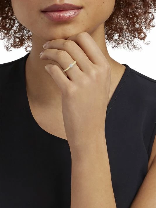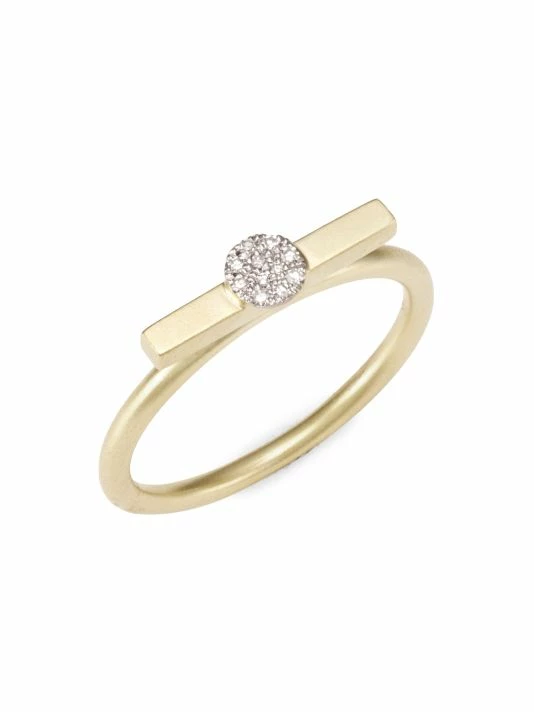 Sophisticated two-tone gold ring with a diamond disc pendant at its center.