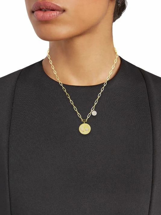Made of 14K yellow gold, this stunning necklace features a celestial medallion detailed with diamond-encrusted moon, starburst and star motifs. Joined to a paperclip chain, this exquisite pendant is accented by a petite diamond-encrusted disk at the side.