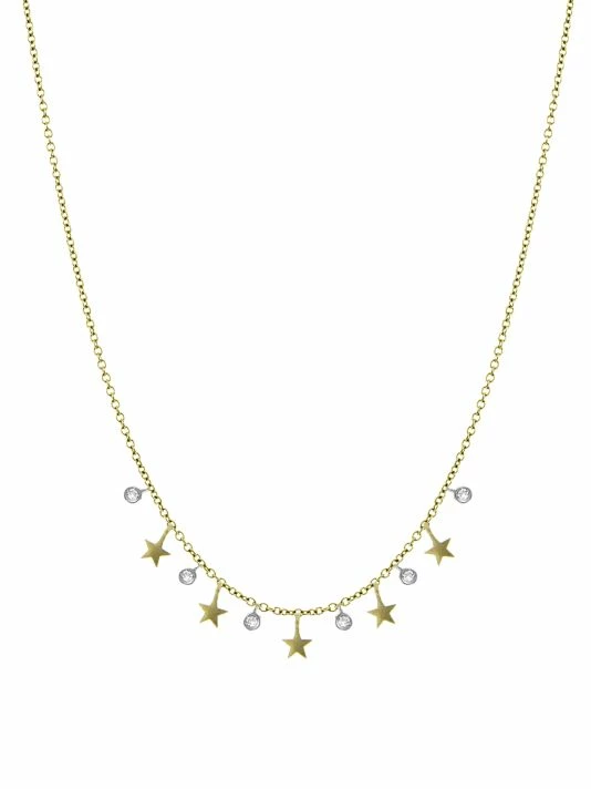 Delicate chain necklace is elevated with an array of gold stars and round diamond charms.