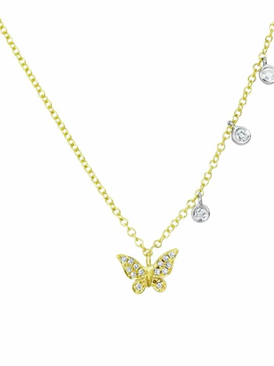Polished chain necklace adorned with three shimmering diamonds and butterfly charm encrusted with diamonds.