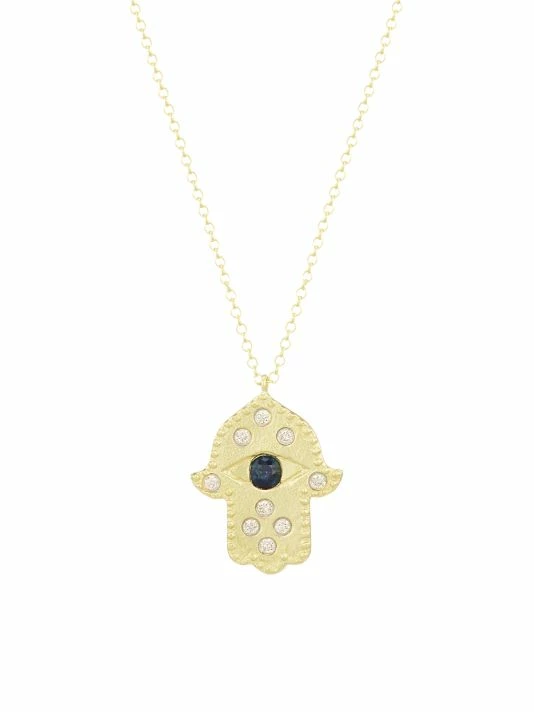 Crafted of 14K yellow gold, this necklace features a whimsical hamsa hand pendant gypsy-set with sparkling round white diamonds and a center blue sapphire.