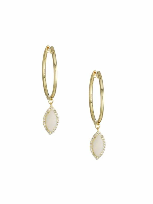 Diamond-lined teardrop opal drops dangle and shimmer from polished gold hoops.