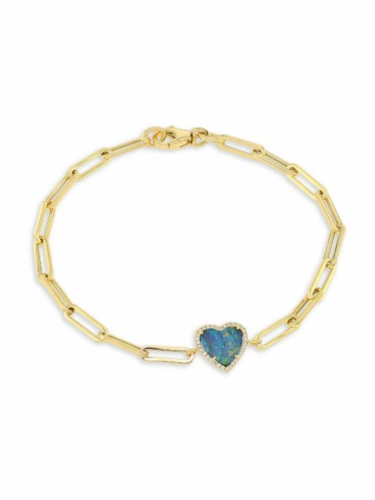 A striking heart-shaped opal framed in diamond pavรฉ glows on an polished oval-link bracelet.