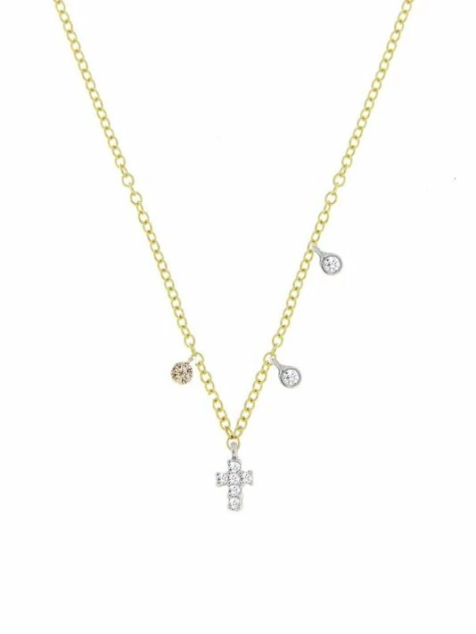A diamond-studded cross pendant centers this station necklace.