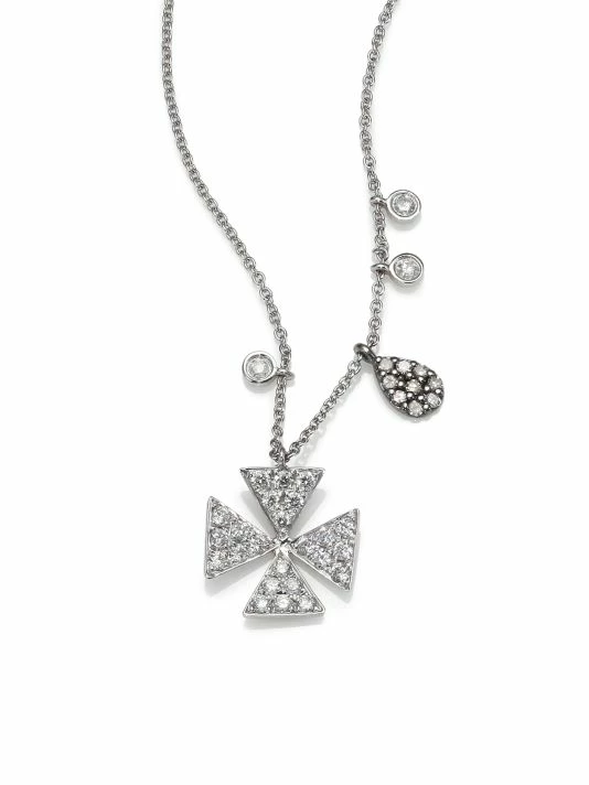 A sharp, angular cross pendant, encrusted entirely with diamonds, sways gracefully between delicate bezel-set charms and a single, pavé blackened teardrop, beneath a trace cable chain of sleek 14k white gold.