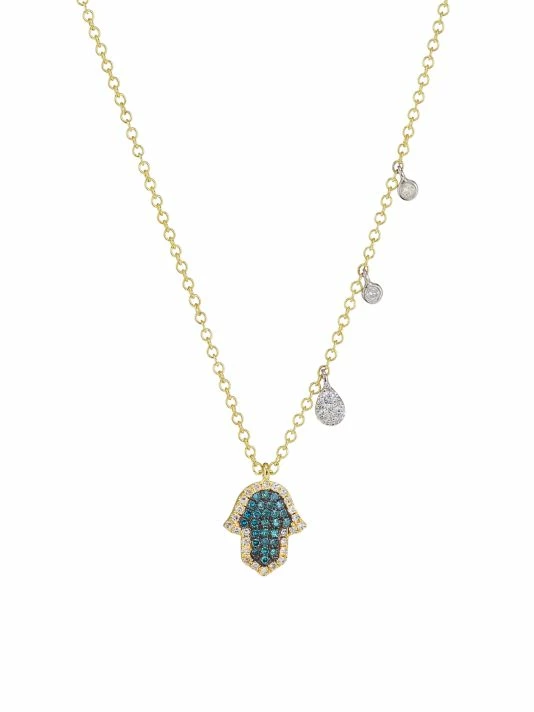 A dainty yellow gold chain necklace dangles a timeless Hamsa encrusted with blue diamonds and three white gold diamond charms.